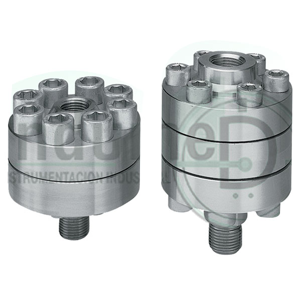 Separador de diafragma de alta presión, 2 y 3 cuerpos Indumed®, que son realizados para aislar el elemento sensible de manómetros, presostatos, transmisores eléctricos de presión, de fluidos de tipo corrosivos, viscosos, sedimentados y con altas temperaturas y presión.