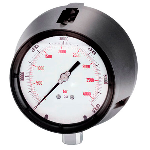 El manómetro fenólico DN125 Inferior Indumed® es, en caso de pérdida o rotura del elemento sensible, el operador está protegido por una célula de seguridad “solid-front” en AISI 304 que, además del frontal del instrumento, protege la parte lateral del equipo y, al estar soldado con racord de conexión, le confiere una excepcional solidez. La energía generada en caso de rotura se canaliza hacia la parte posterior del equipo, donde su tapa posterior de seguridad es expulsada, permitiendo liberar dicha energía. Son normalmente utilizados en la industria química, petroquímica, centrales convencionales. Su mecanismo amortizado le confiere una especial adaptación a la instalación en presencia de vibraciones y presiones pulsantes.